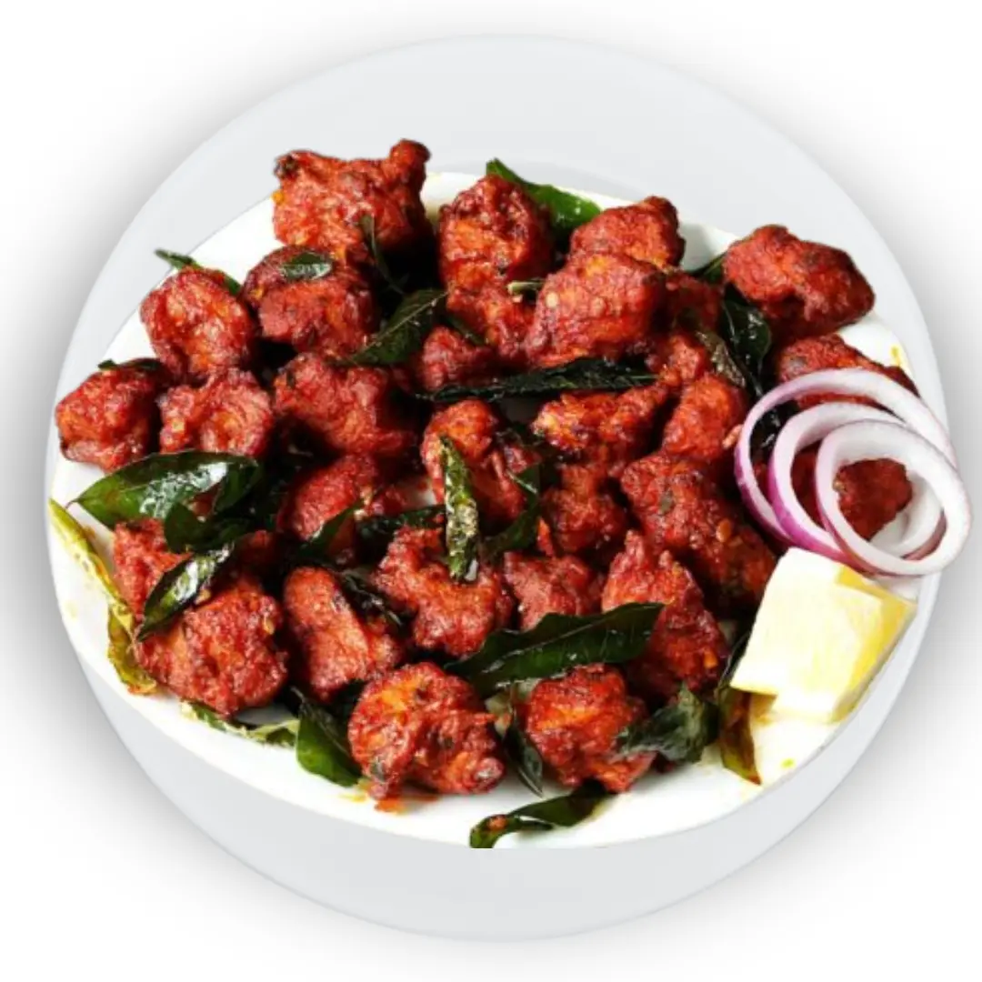 Crispy fried boneless chicken tossed in bold spices, garlic, red chillies, and curry leaves. Bursting with flavor and perfect as a snack or appetizer